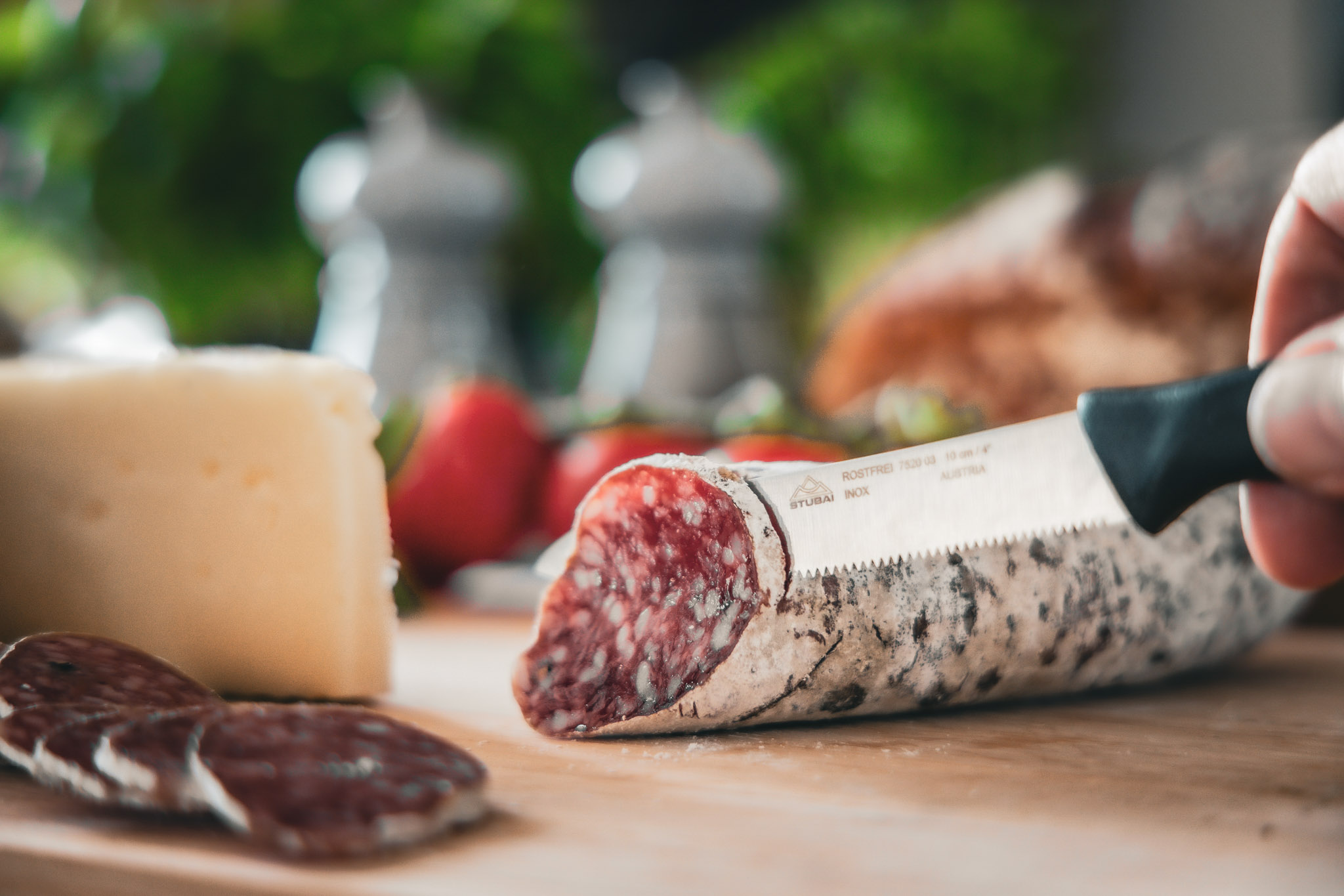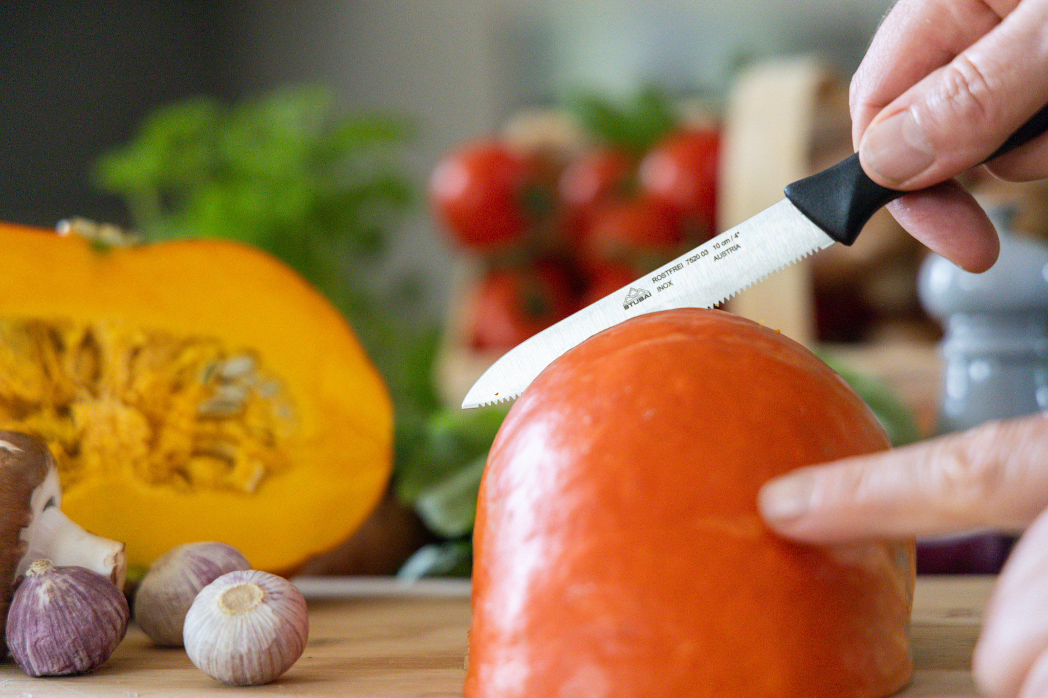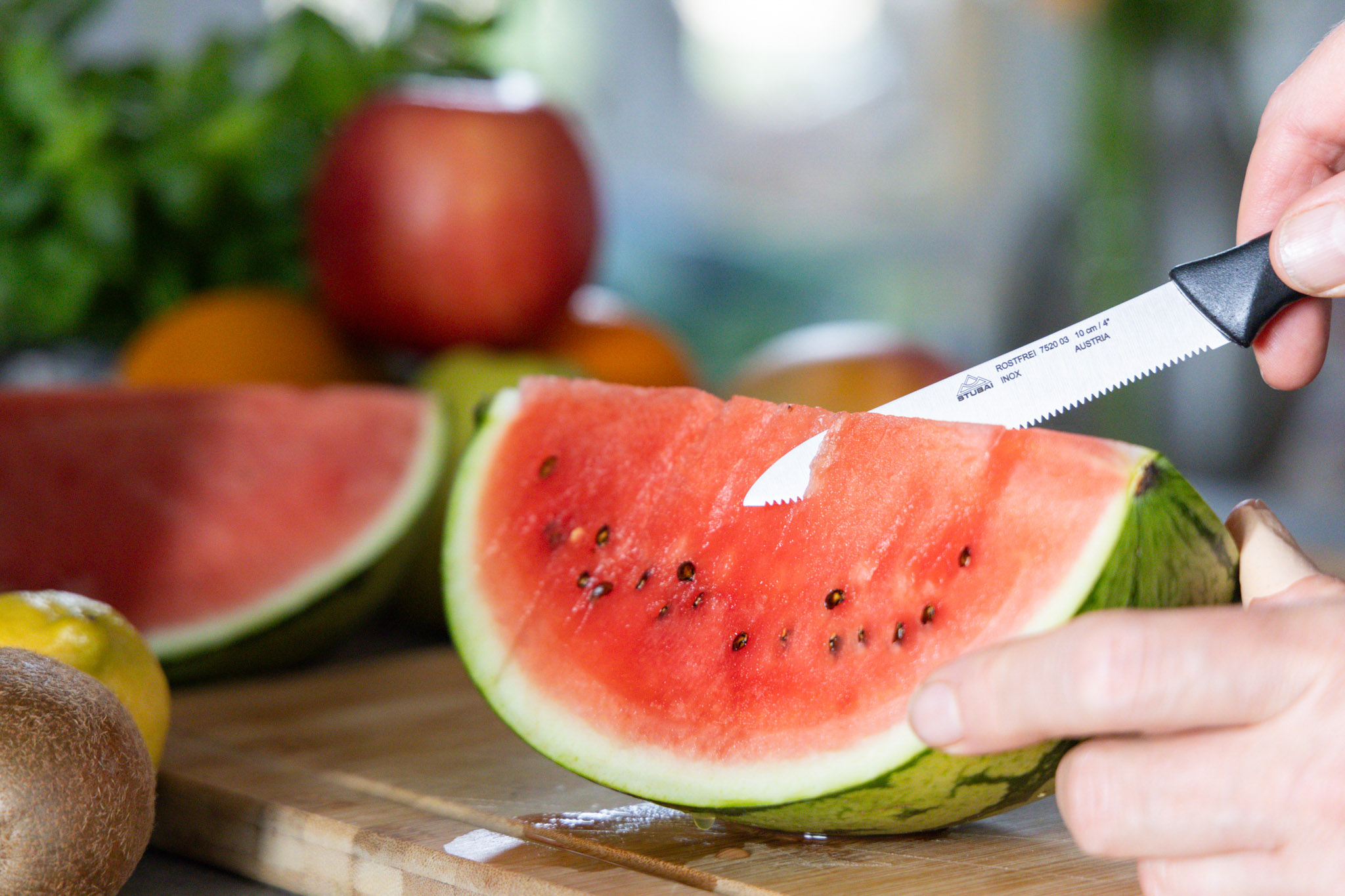 • Stable handling: Always hold the knife by the handle and ensure that the food is placed securely on the surface and does not slip. Make sure the blade does not come into contact with your hand or other body parts, especially during use or when handing the knife to someone else.
