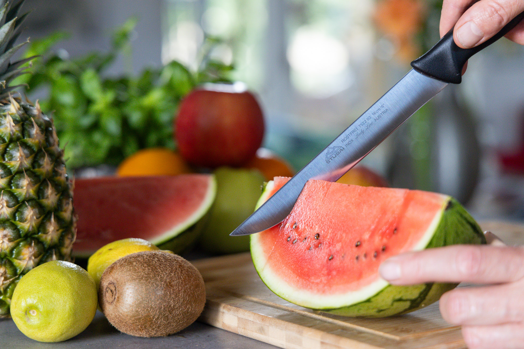 • Stable handling: Always hold the knife by the handle and ensure that the food is placed securely on the surface and does not slip. Make sure the blade does not come into contact with your hand or other body parts, especially during use or when handing the knife to someone else.