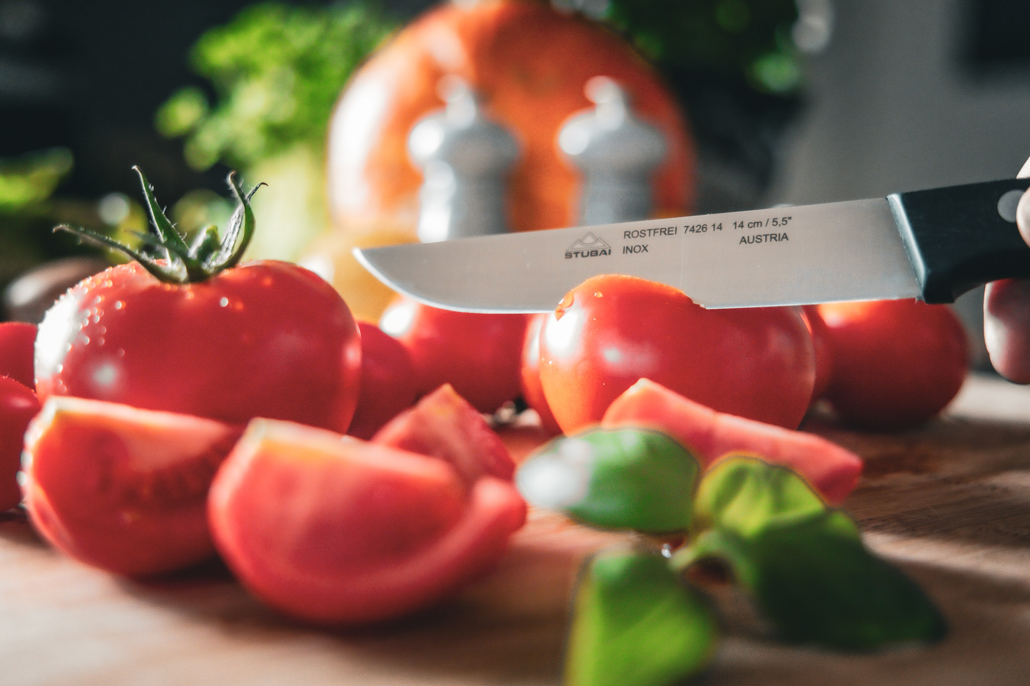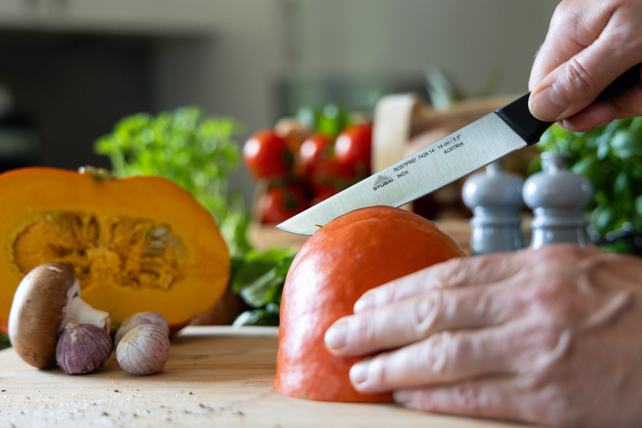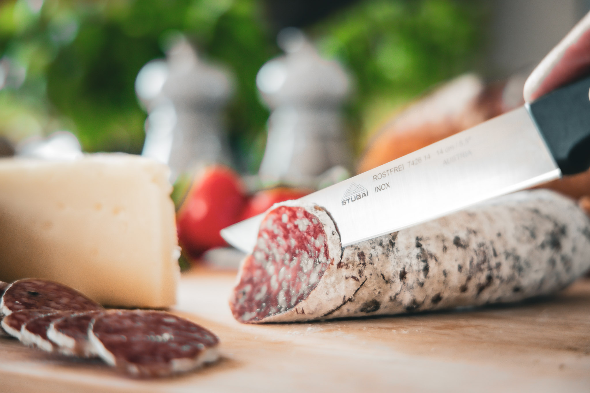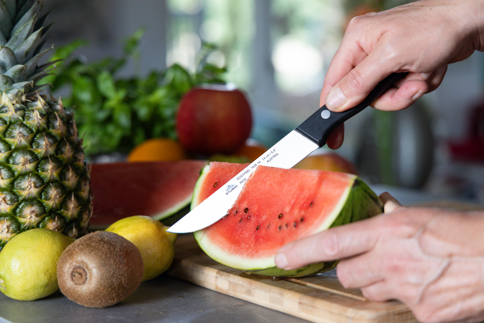 • Nutzen Sie ein Schneidbrett aus Holz, Bambus oder anderem für Lebensmittel zugelassenem Material, um die Klinge Ihres Messers zu schonen und die Schärfe langfristig zu bewahren.