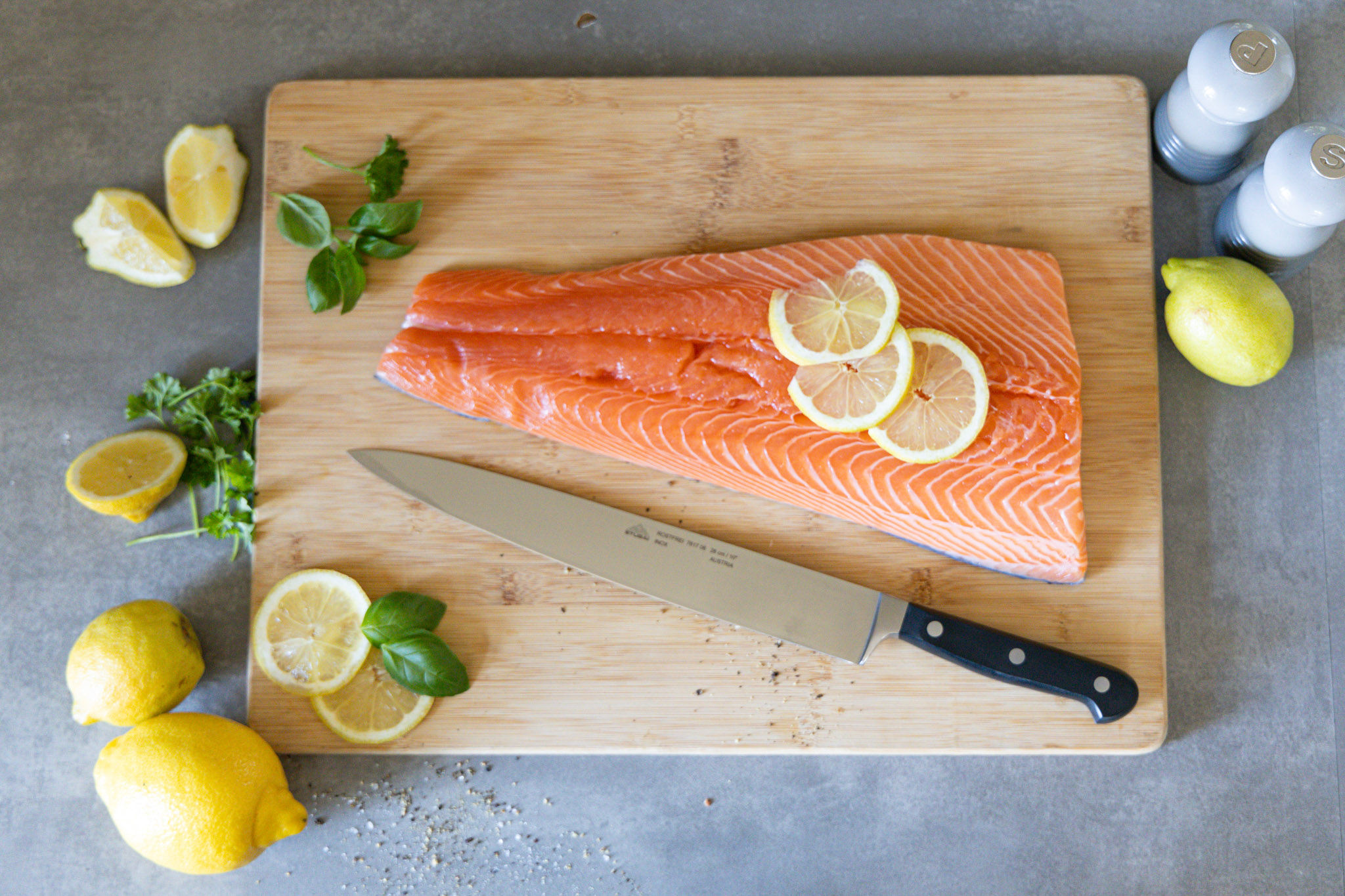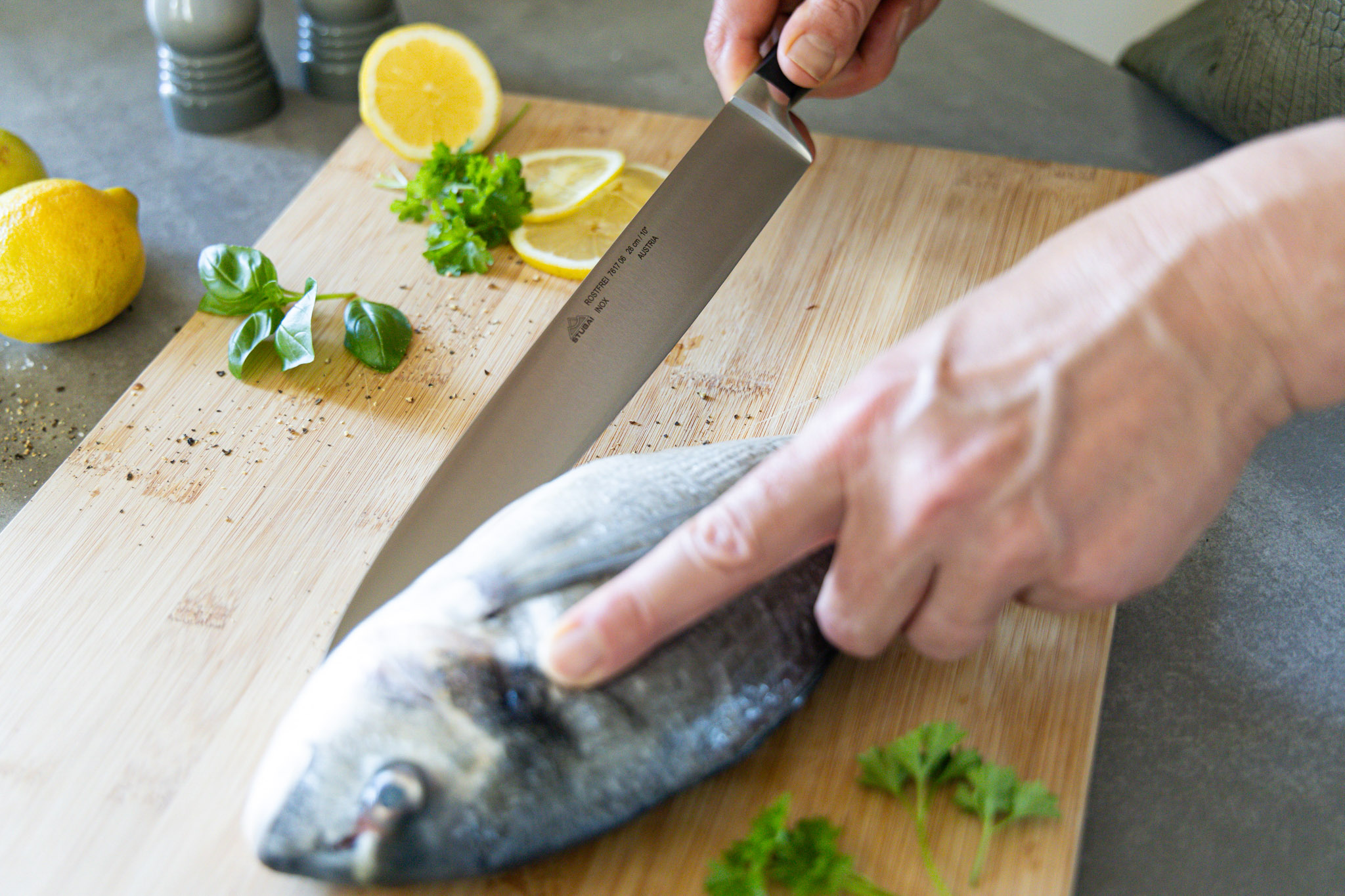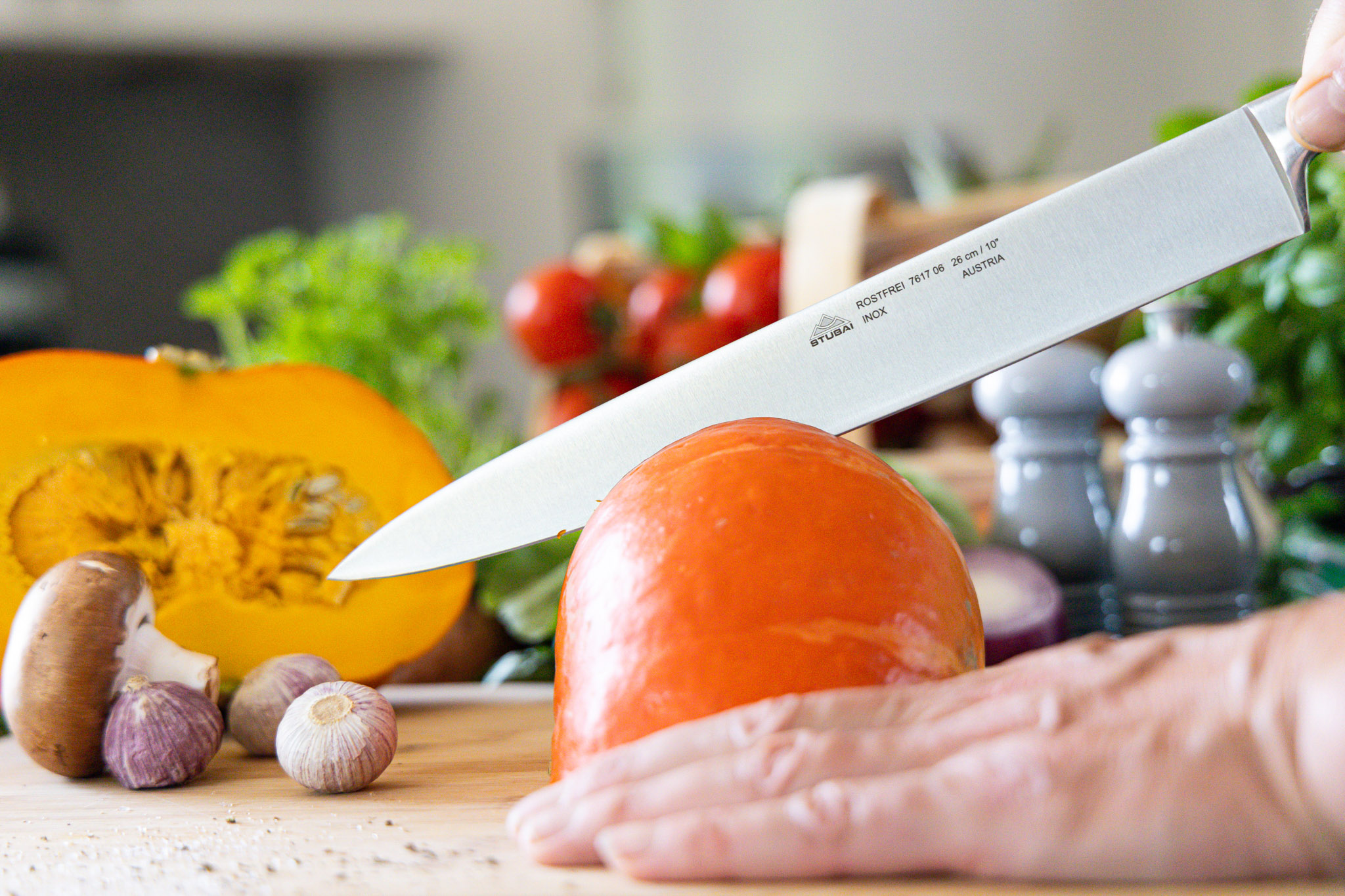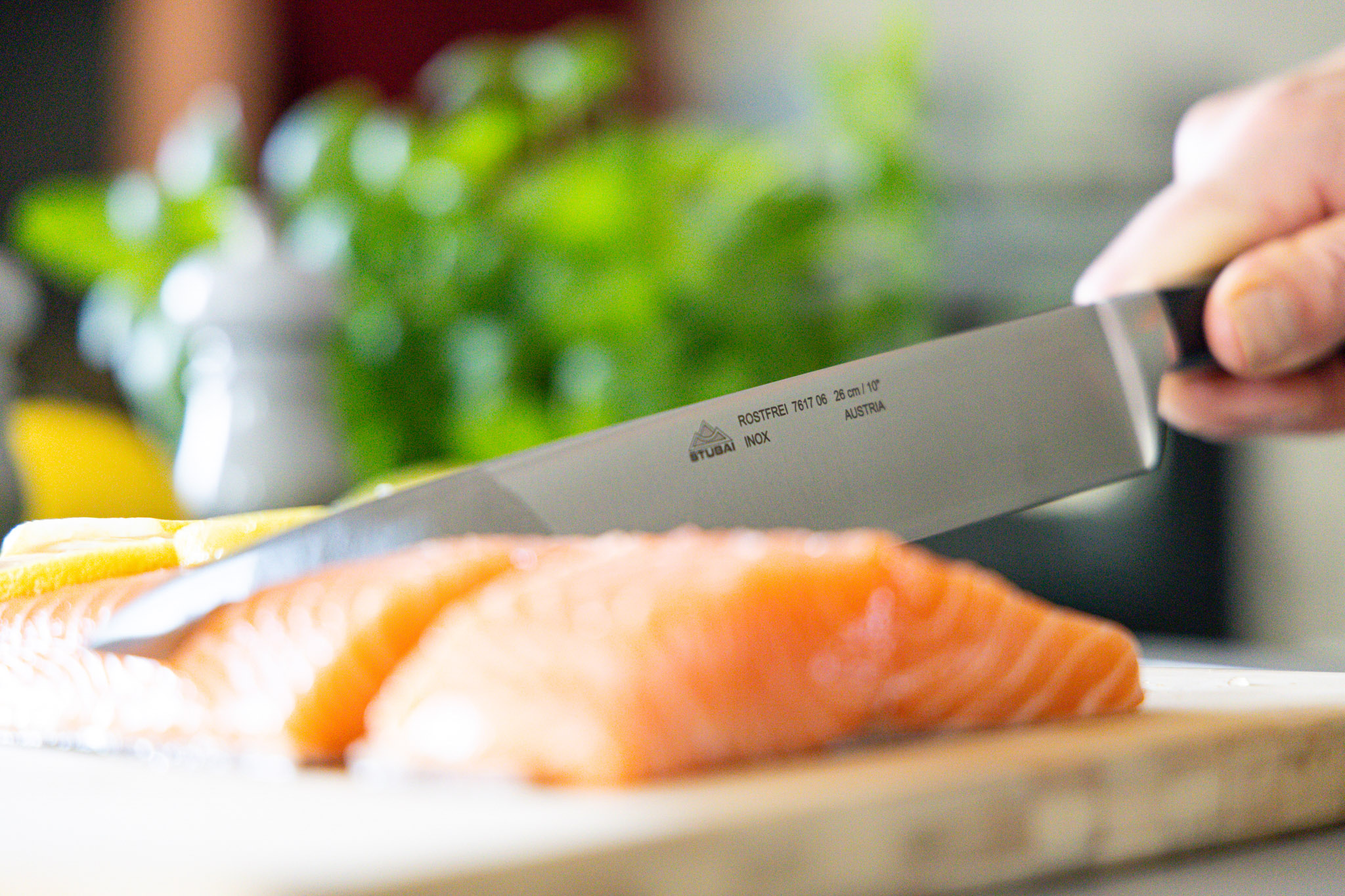 • Nutzen Sie ein Schneidbrett aus Holz, Bambus oder anderem für Lebensmittel zugelassenem Material, um die Klinge Ihres Messers zu schonen und die Schärfe langfristig zu bewahren.